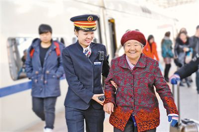 沈陽鐵路部門采取多項新舉措,溫暖旅客回家路。圖為日前吉林至北京D74次列車長劉露攙扶行動不便的老年旅客乘車。