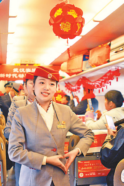 2月7日,在武漢鐵路局與有關(guān)部門的組織下,500多名農(nóng)民工坐上了武昌至利川的D5702次返鄉(xiāng)“愛心專列”。圖為列車員為工友們表演節(jié)目。