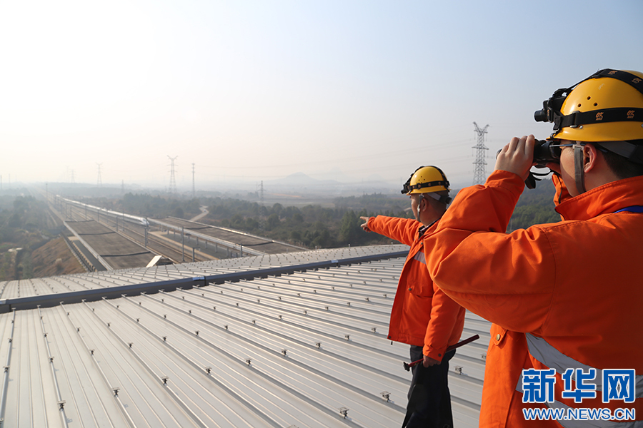 徐小云和李浩翔站在屋面,用望遠(yuǎn)鏡對(duì)站臺(tái)雨棚頂部進(jìn)行檢查。