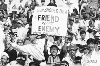 圖為在巴基斯坦拉瓦爾品第舉行的一場巴基斯坦隊與印度隊的板球比賽中,一名當?shù)啬泻⑴e起了“我們應(yīng)該是朋友而不是敵人”的標語。 圖片來自網(wǎng)絡(luò)