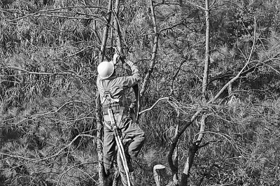 2月11日,為保障鐵路行車安全,中國(guó)鐵路南昌局集團(tuán)公司南平工務(wù)段職工攀上離線路20米的歪斜危樹修剪樹枝。陽(yáng)豆攝/光明圖片