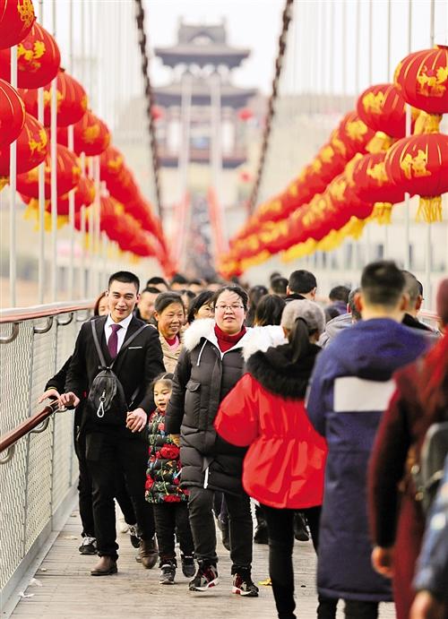 2月18日,四川南充市嘉陵區(qū)天樂(lè)谷景區(qū)孝心橋,游客參加踩橋民俗游。春節(jié)期間,民俗旅游成為春節(jié)旅游消費(fèi)主角。 張智勇攝