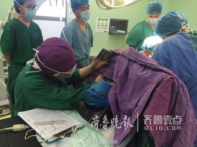 近日,在山東大學第二醫(yī)院手術室里,13歲的樂樂正在接受手術,局部麻醉的他"情緒有些焦躁,一直小聲哼哼"。為不影響手術安全,護士張慧全程半蹲在旁邊,手舉手機為樂樂播放動畫片,一個小時后,手術順利完成。圖片來源:齊魯壹點