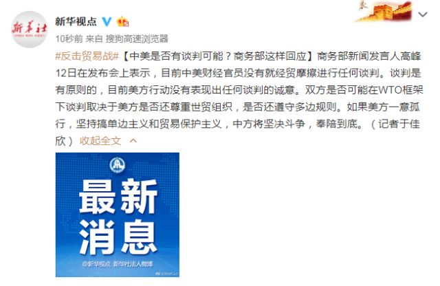 【中美是否有談判可能?商務(wù)部這樣回應(yīng)】商務(wù)部新聞發(fā)言人高峰12日在發(fā)布會上表示,目前中美財經(jīng)官員沒有就經(jīng)貿(mào)摩擦進行任何談判。談判是有原則的,目前美方行動沒有表現(xiàn)出任何談判的誠意。雙方是否可能在WTO框架下談判取決于美方是否還尊重世貿(mào)組織,是否還遵守多邊規(guī)則。如果美方一意孤行,堅持搞單邊主義和貿(mào)易保護主義,中方將堅決斗爭,奉陪到底。(記者于佳欣)