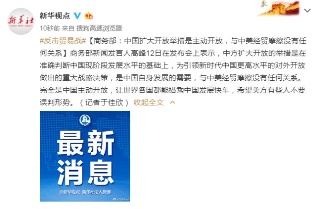 【商務(wù)部:中國擴大開放舉措是主動開放,與中美經(jīng)貿(mào)摩擦沒有任何關(guān)系】商務(wù)部新聞發(fā)言人高峰12日在發(fā)布會上表示,中方擴大開放的舉措是在準確判斷中國現(xiàn)階段發(fā)展水平的基礎(chǔ)上,為引領(lǐng)新時代中國更高水平的對外開放做出的重大戰(zhàn)略決策,是中國自身發(fā)展的需要,與中美經(jīng)貿(mào)摩擦沒有任何關(guān)系。完全是中國主動開放,讓世界各國都能搭乘中國發(fā)展快車,希望美方有些人不要誤判形勢。(記者于佳欣)