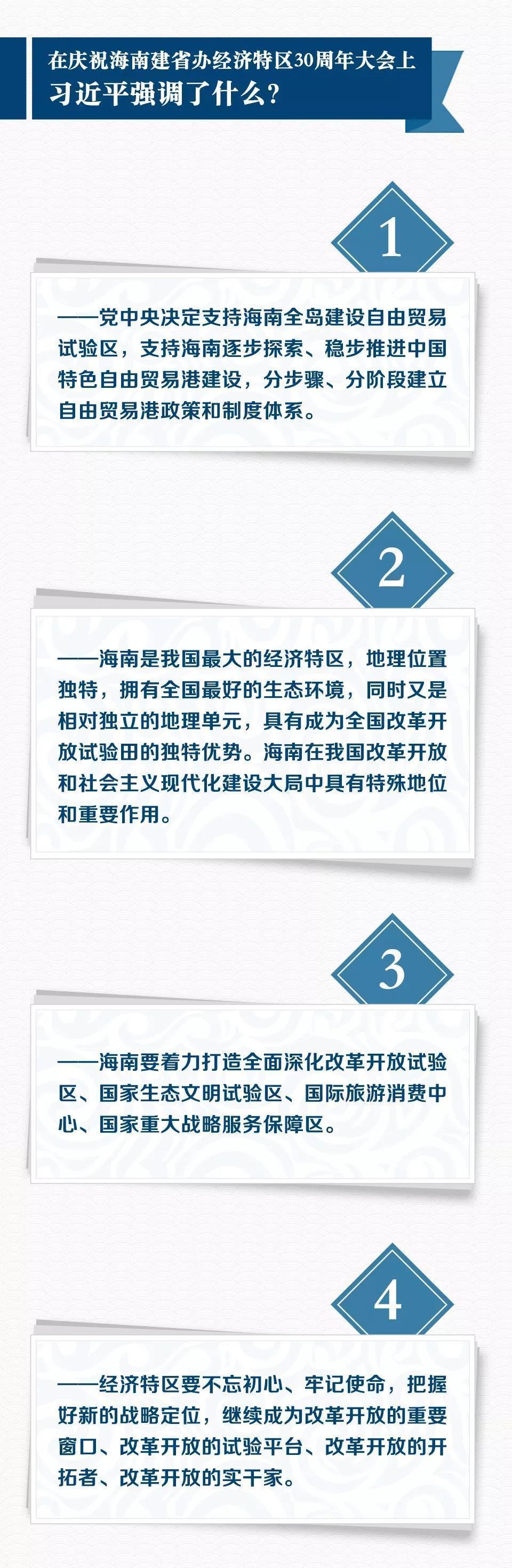 當(dāng)天下午,慶祝海南建省辦經(jīng)濟(jì)特區(qū)30周年大會(huì)在?诼≈嘏e行,習(xí)近平出席大會(huì)并發(fā)表重要講話。他說,黨中央最近研究制定了《關(guān)于支持海南全面深化改革開放的指導(dǎo)意見》。新時(shí)代,海南要高舉改革開放旗幟,創(chuàng)新思路、凝聚力量、突出特色、增創(chuàng)優(yōu)勢(shì),努力成為新時(shí)代全面深化改革開放的新標(biāo)桿,形成更高層次改革開放新格局。