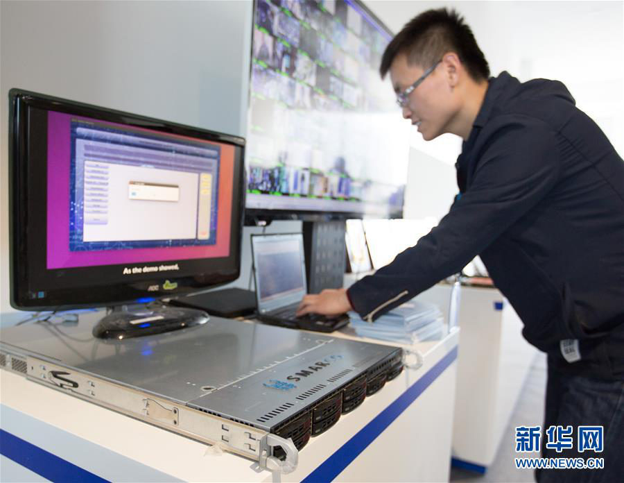 2017年12月,北京智能計算產業(yè)研究院舉行的發(fā)布會上,工作人員現場演示高通量人工智能一體機的應用。(圖片來源:新華社)