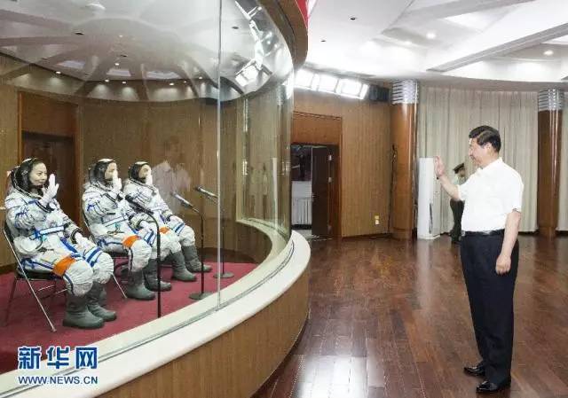 2013年6月11日,習(xí)近平來(lái)到酒泉衛(wèi)星發(fā)射中心為即將出征的航天員聶海勝、張曉光、王亞平壯行。(圖片來(lái)源:新華社)