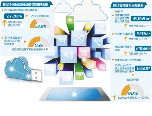 “數(shù)字經(jīng)濟(jì)已成為近年來帶動(dòng)經(jīng)濟(jì)增長(zhǎng)的核心動(dòng)力,2017年我國(guó)數(shù)字經(jīng)濟(jì)對(duì)GDP的貢獻(xiàn)率為55%,接近甚至超越了某些發(fā)達(dá)國(guó)家水平!敝袊(guó)信息通信研究院政策與經(jīng)濟(jì)研究所所長(zhǎng)魯春叢表示,根據(jù)中國(guó)信息通信研究院測(cè)算,2017年我國(guó)數(shù)字經(jīng)濟(jì)總量達(dá)到27.2萬(wàn)億元,同比名義增長(zhǎng)20.3%,占GDP比重達(dá)到32.9%。隨著信息化發(fā)展環(huán)境的全面推進(jìn),我國(guó)數(shù)字經(jīng)濟(jì)發(fā)展“水漲船高”。