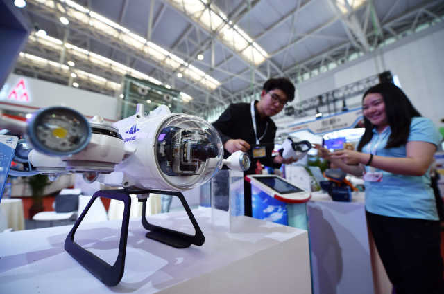 5月17日,觀眾在天津梅江會展中心智能科技展上參觀深之藍的水下機器人。新華社記者 李然 攝
