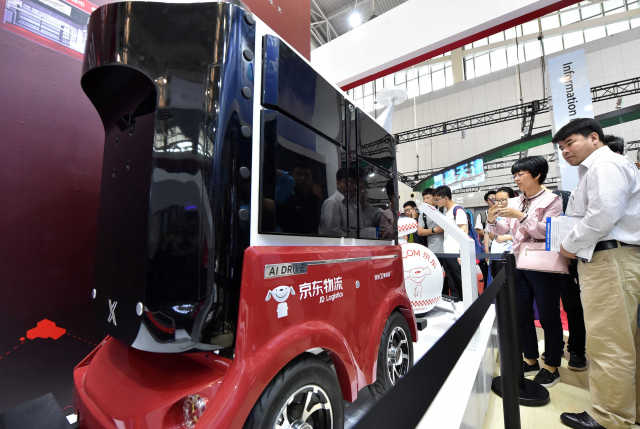5月17日,觀眾在天津梅江會展中心智能科技展上參觀京東物流車。新華社記者 李然 攝