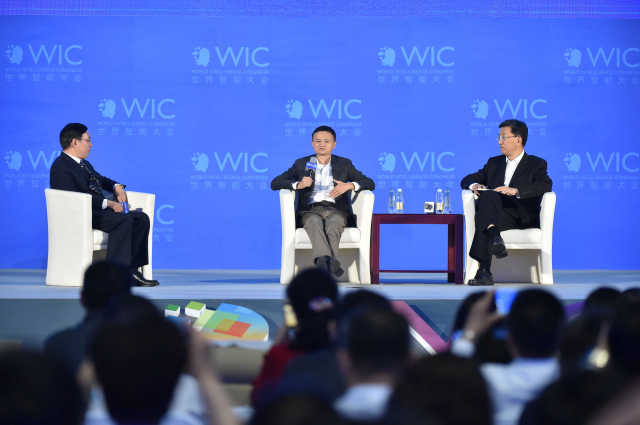 5月16日,阿里巴巴集團董事局主席馬云(中)在天津舉行的第二屆世界智能大會主論壇上就人工智能的現(xiàn)狀與未來進行發(fā)言。新華社記者 李然 攝