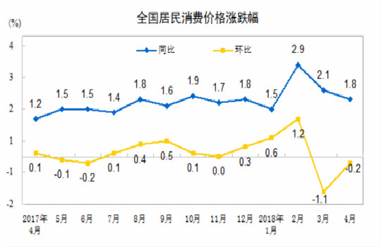 國家統(tǒng)計局數(shù)據(jù)顯示,4月份CPI同比上漲1.8%,漲幅較3月小幅回落0.3個百分點,跌回了“1時代”。