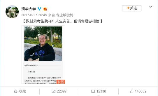 首先恭喜你即將來到清華大學(xué),繼續(xù)你的學(xué)習(xí)和生活。我們看到了你寫給清華大學(xué)的文章《一位甘肅高分考生的請(qǐng)求》,相信你早已具備了清華人自強(qiáng)不息、厚德載物的品質(zhì),我們代表清華園歡迎來自甘肅定西的你!