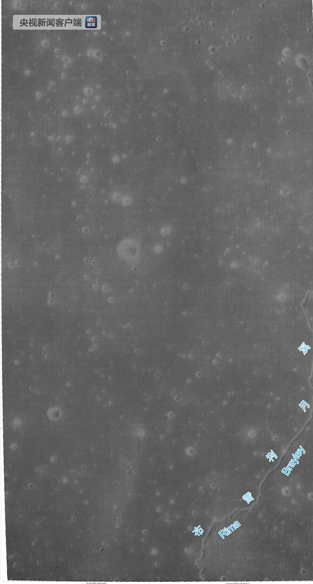 。ㄓ跋駡D位于雨海西南部,寬約30.5千米,長(zhǎng)約57.1千米。該區(qū)域表面較平坦,分布有小型環(huán)形坑,其中最大的環(huán)形坑直徑約1.9千米。影像圖右下角較為明顯的月貌特征為布雷利月溪的局部,在影像圖中的長(zhǎng)度約為36.2千米)