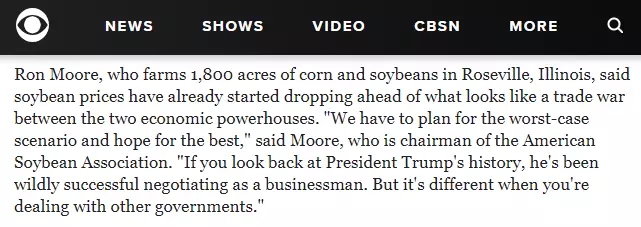 美國媒體哥倫比亞廣播公司援引美聯(lián)社報(bào)道稱,在伊利諾伊州羅塞維爾農(nóng)場種植1800英畝玉米和大豆的羅恩 穆爾說,大豆價(jià)格已經(jīng)開始下跌。