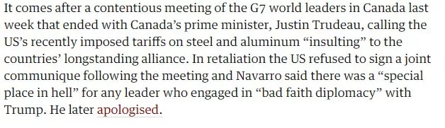 白宮貿(mào)易顧問納瓦羅(Peter Navarro)當(dāng)天也反懟,任何背后捅特朗普刀子的外國領(lǐng)導(dǎo)人都要“下地獄”。
