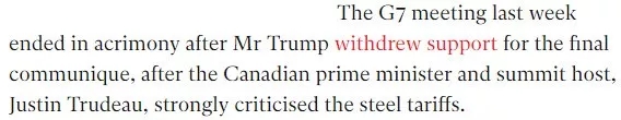 《衛(wèi)報(bào)》報(bào)道稱,對(duì)華貿(mào)易戰(zhàn)升級(jí)的前不久,也就是上周,備受爭議的七國集團(tuán)峰會(huì)在加拿大總理特魯多的一席話中結(jié)束:“特朗普對(duì)加拿大征收鋼鋁關(guān)稅是對(duì)兩國長期友好關(guān)系的‘侮辱’!
