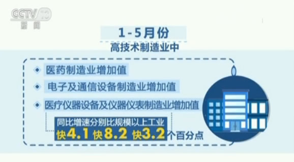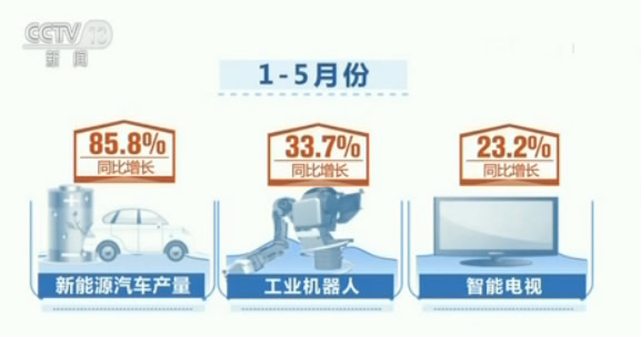 實(shí)體經(jīng)濟(jì)發(fā)展向好的同時(shí),工業(yè)結(jié)構(gòu)不斷優(yōu)化,向中高端邁進(jìn)勢(shì)頭明顯。1到5月份,高技術(shù)制造業(yè)中,醫(yī)藥制造業(yè)、電子及通信設(shè)備制造業(yè)、醫(yī)療儀器設(shè)備及儀器儀表制造業(yè)增加值同比增速分別比規(guī)模以上工業(yè)快4.1、8.2和3.2個(gè)百分點(diǎn)。低碳化、智能化、網(wǎng)絡(luò)化、信息化快速發(fā)展,新產(chǎn)品大量增加。1到5月份,新能源汽車產(chǎn)量同比增長(zhǎng)85.8%,工業(yè)機(jī)器人增長(zhǎng)33.7%,智能電視增長(zhǎng)23.2%,3D打印設(shè)備、石墨烯等產(chǎn)品快速增長(zhǎng)。