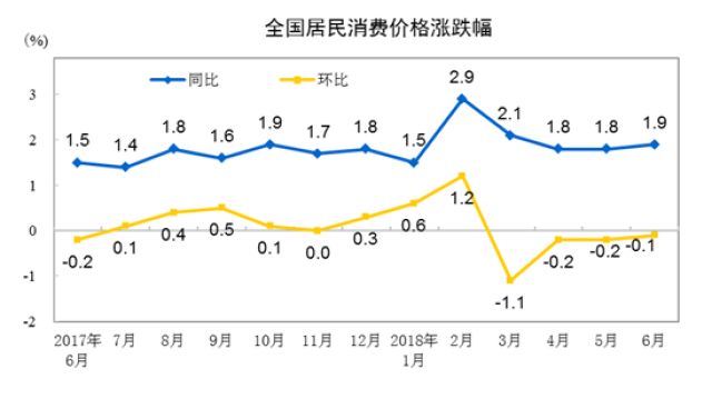 2018年6月份,全國(guó)居民消費(fèi)價(jià)格同比上漲1.9%。其中,城市上漲1.8%,農(nóng)村上漲1.9%;食品價(jià)格上漲0.3%,非食品價(jià)格上漲2.2%;消費(fèi)品價(jià)格上漲1.5%,服務(wù)價(jià)格上漲2.4%。上半年,全國(guó)居民消費(fèi)價(jià)格比去年同期上漲2.0%。