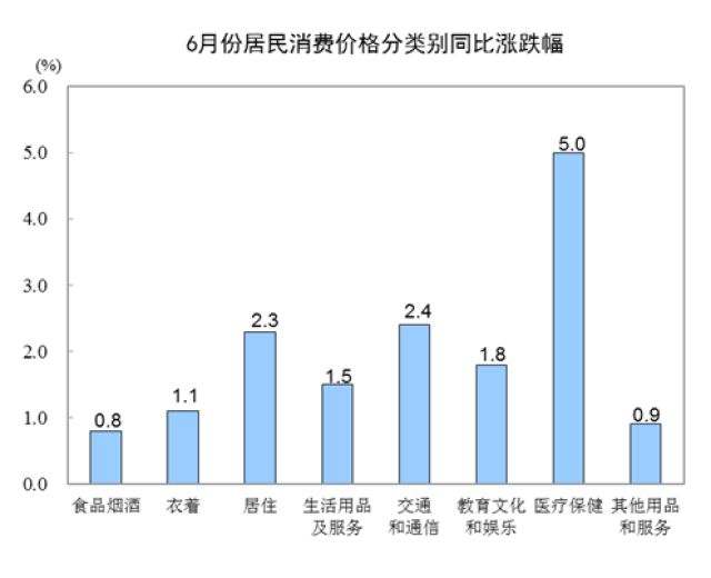 其他七大類價(jià)格同比均上漲。其中,醫(yī)療保健、交通和通信、居住價(jià)格分別上漲5.0%、2.4%和2.3%,教育文化和娛樂、生活用品及服務(wù)價(jià)格分別上漲1.8%和1.5%,衣著、其他用品和服務(wù)價(jià)格分別上漲1.1%和0.9%。
