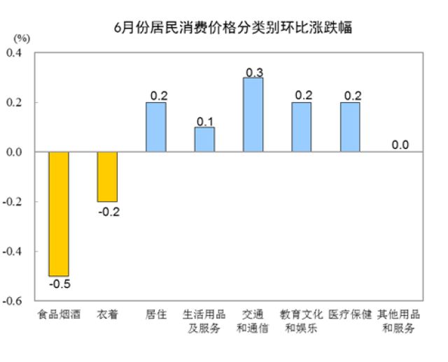 6月份,全國(guó)居民消費(fèi)價(jià)格環(huán)比下降0.1%。其中,城市持平,農(nóng)村下降0.1%;食品價(jià)格下降0.8%,非食品價(jià)格上漲0.1%;消費(fèi)品價(jià)格下降0.2%,服務(wù)價(jià)格上漲0.2%。