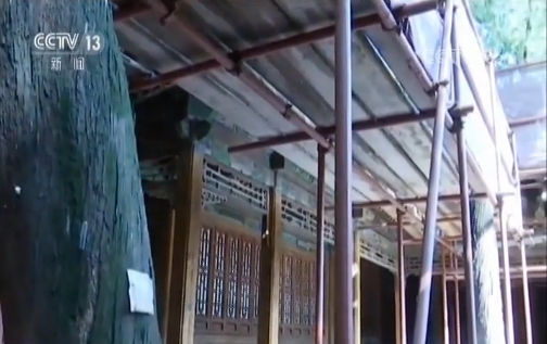 故宮博物院古建部楊紅說,支頂?shù)倪^程中,大木構(gòu)件它會稍微有一些歪閃或者晃動,有可能這些彩畫有一些剝落、剝離的這種現(xiàn)象,所以我們在這個擷芳亭大木加固之前、支頂之前,我們對彩畫這部分要對它進行預加固。