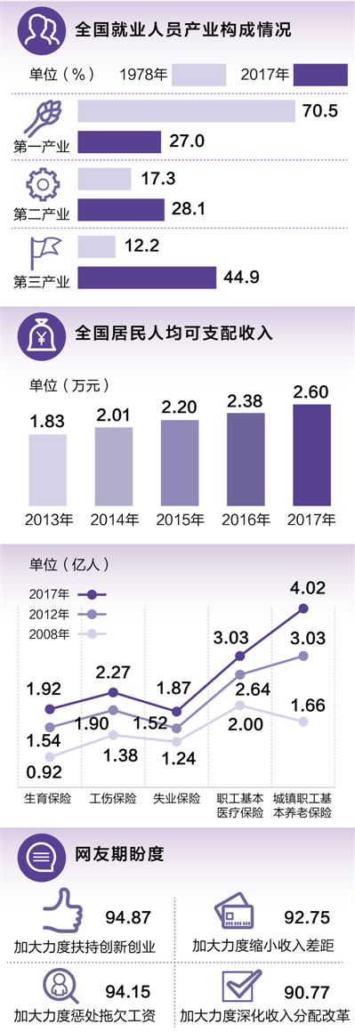 2017年末全國就業(yè)人員達7.76億人,比1978年增加3.75億人。不僅僅是數(shù)量上的變化,隨著我國經(jīng)濟結(jié)構(gòu)的持續(xù)優(yōu)化,就業(yè)結(jié)構(gòu)逐步改善,就業(yè)的渠道越來越寬了。