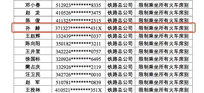 9月3日,國家公共信用信息中心公布8月份新增失信聯(lián)合懲戒對象名單,孫赫出現(xiàn)在“黑名單”中,被限制乘坐所有火車席別。