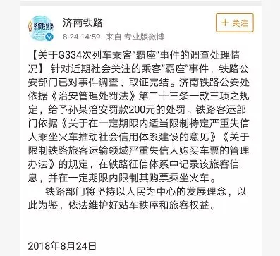 8月24日,濟(jì)南鐵路公安處依據(jù)《治安管理處罰法》第二十三條一款三項之規(guī)定,給予孫某治安罰款200元的處罰。