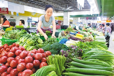 圖為9月10日,在南京一家農(nóng)貿(mào)市場(chǎng),一名商販在整理蔬菜。