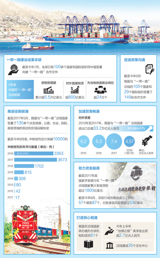2018年是“一帶一路”倡議提出5周年。2013年,習(xí)近平主席在哈薩克斯坦和印度尼西亞提出共建“一帶一路”倡議,得到積極響應(yīng);截至今年7月,全球已有100多個國家和國際組織同中國簽署共建“一帶一路”合作文件。