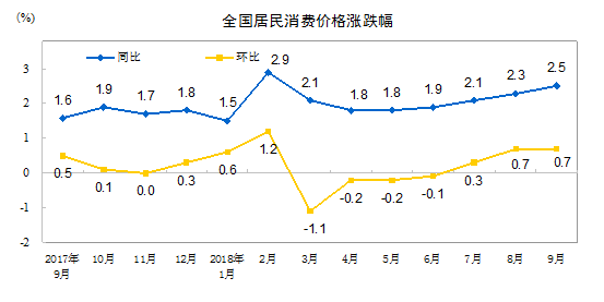 2018年9月份,全國居民消費(fèi)價(jià)格同比上漲2.5%。其中,城市上漲2.4%,農(nóng)村上漲2.5%;食品價(jià)格上漲3.6%,非食品價(jià)格上漲2.2%;消費(fèi)品價(jià)格上漲2.7%,服務(wù)價(jià)格上漲2.1%。1-9月平均,全國居民消費(fèi)價(jià)格比去年同期上漲2.1%。
