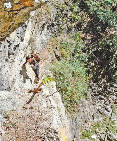 神農(nóng)架國(guó)家公園管護(hù)人員在森林資源二類清查行動(dòng)中穿越陰峪河大峽谷。