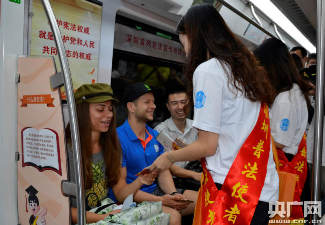 據(jù)了解,深圳市從11月下旬至12月下旬將集中開展憲法學(xué)習(xí)宣傳活動(dòng)。全市普法工作者積極推動(dòng)憲法宣傳創(chuàng)新,努力讓文本上的憲法“活起來(lái)”“落下去”,此次開通的深圳首列憲法宣傳地鐵專列正是深圳普法方式創(chuàng)新的有益嘗試。記者看到,普法地鐵專列外觀靚麗奪目,充滿了憲法法律元素,專列吸引了乘客的目光,不少人掏出手機(jī)駐足拍照。