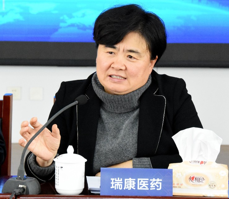 瑞康醫(yī)藥總裁張仁華女士向采訪團(tuán)介紹相關(guān)情況(大眾網(wǎng)記者 石磊 攝)