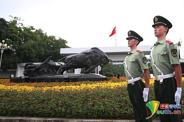 主火炬的光照亮了執(zhí)勤官兵滿是汗的臉龐,盡管一轉(zhuǎn)頭就能看到,但是他們始終堅守崗位,眼里只有警戒區(qū)域的安全。武警廣東總隊深圳支隊供圖