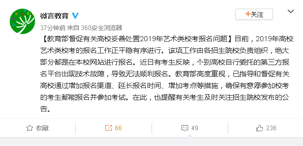 目前,2019年高校藝術(shù)類校考的報名工作正平穩(wěn)有序進(jìn)行。該項工作由各招生院校負(fù)責(zé)組織,絕大部分都是在本校網(wǎng)站進(jìn)行報名。近日有考生反映,個別高校自行委托的第三方報名平臺出現(xiàn)技術(shù)故障,導(dǎo)致無法順利報名。教育部高度重視,已指導(dǎo)和督促有關(guān)高校通過增加報名渠道、延長報名時間、增加考點等措施,確保有意愿參加?嫉目忌寄軋竺⒓涌荚。在此,也提醒有關(guān)考生及時關(guān)注招生院校發(fā)布的公告。