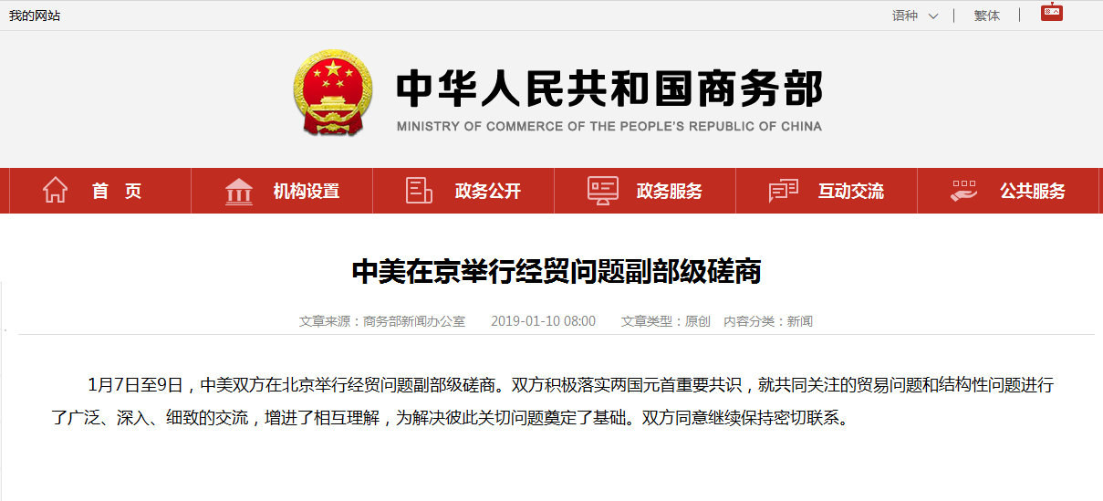 商務部聲明:1月7日至9日,中美雙方在北京舉行經(jīng)貿(mào)問題副部級磋商。雙方積極落實兩國元首重要共識,就共同關注的貿(mào)易問題和結構性問題進行了廣泛、深入、細致的交流,增進了相互理解,為解決彼此關切問題奠定了基礎。