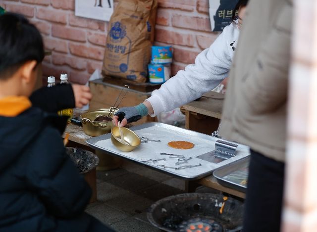 2月5日,在韓國(guó)京畿道龍仁市的韓國(guó)民俗村,小朋友觀看制作傳統(tǒng)的糖餅。