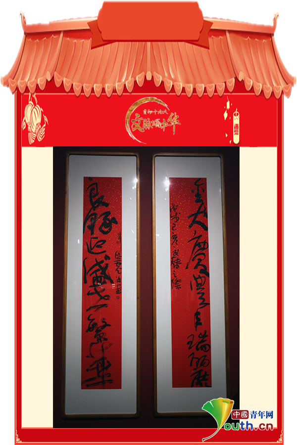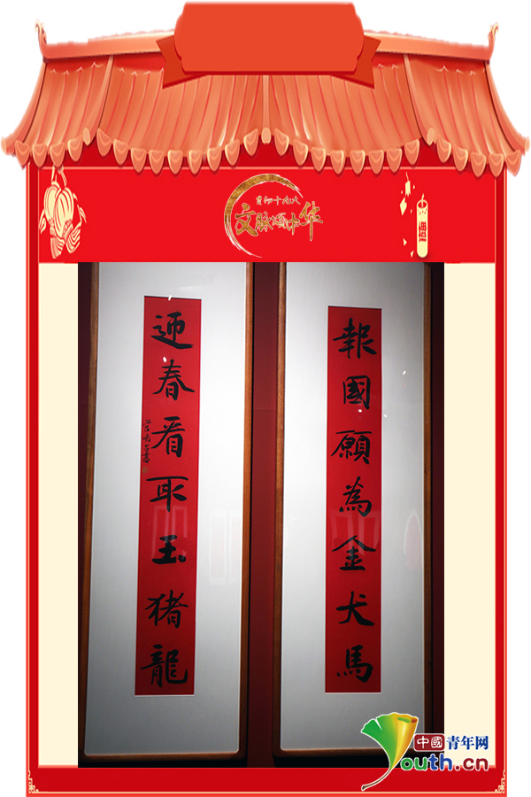 楹聯(lián)“報(bào)國(guó)愿為金犬馬,迎春看取玉豬龍”。中國(guó)青年網(wǎng)記者葉婉瑩 攝