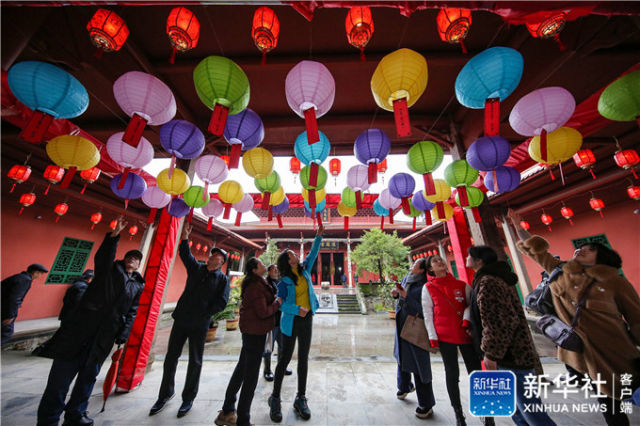 ↑2月10日,人們在江西萍鄉(xiāng)市南正街廟會上猜燈迷。(李桂東 攝)