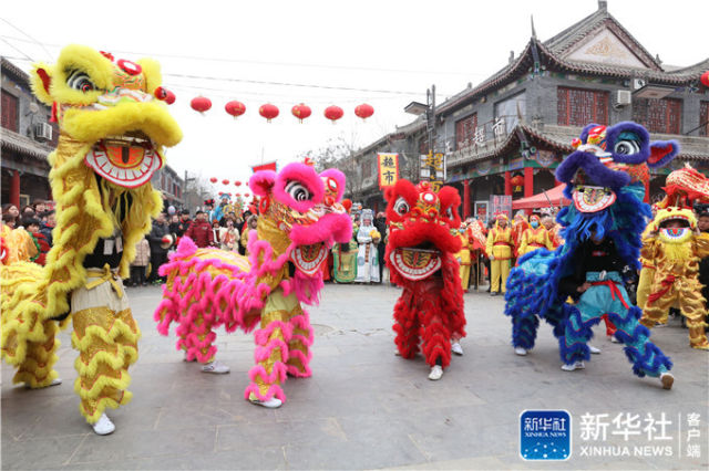 ↑2月10日,民間藝人在河北邯鄲市廣府古城廟會上表演舞獅。(楊揚(yáng) 攝)