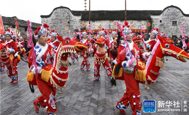 ↑ 2月10日,在浙江臺州市仙居縣埠頭鎮(zhèn)樓下王村,村民表演傳統(tǒng)民俗“跳跳馬”。(王華斌 攝)