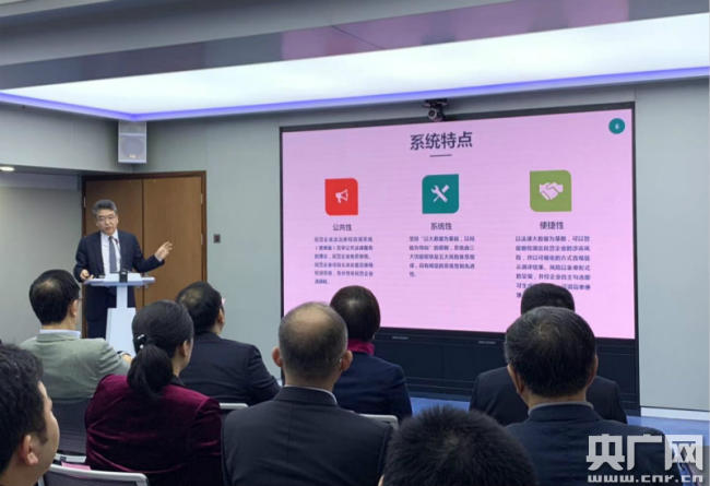 深圳市司法局局長蔣溪林介紹“民營企業(yè)法治體檢自測(cè)系統(tǒng)”。(央廣網(wǎng)記者 黃倩 攝)