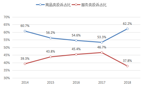 一是商品投訴比重?cái)U(kuò)大。2018年,全國市場(chǎng)監(jiān)管部門共受理商品投訴231.81萬件,占比62.2%,同比增長(zhǎng)61.3%,服務(wù)投訴140.75萬件,占比37.8%,同比增長(zhǎng)12.1%。商品投訴主要集中在日用百貨、食品、家用電器、交通工具、通訊器材等領(lǐng)域。服務(wù)投訴主要集中在遠(yuǎn)程購物、居民服務(wù)、互聯(lián)網(wǎng)服務(wù)、文化娛樂服務(wù)、修理維護(hù)服務(wù)等領(lǐng)域。