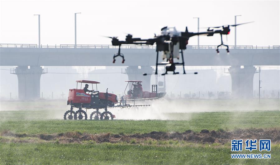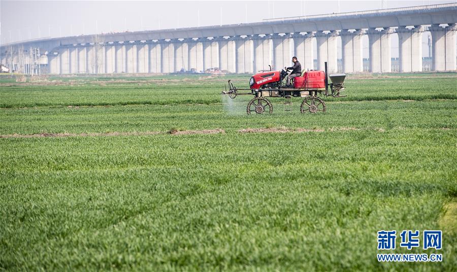 3月16日,在湖北省襄陽市襄州區(qū)的10萬畝小麥綠色高質(zhì)高效示范區(qū),農(nóng)業(yè)技術(shù)推廣人員進行病蟲害機械化綠色綜合防控作業(yè)。新華社記者 肖藝九 攝