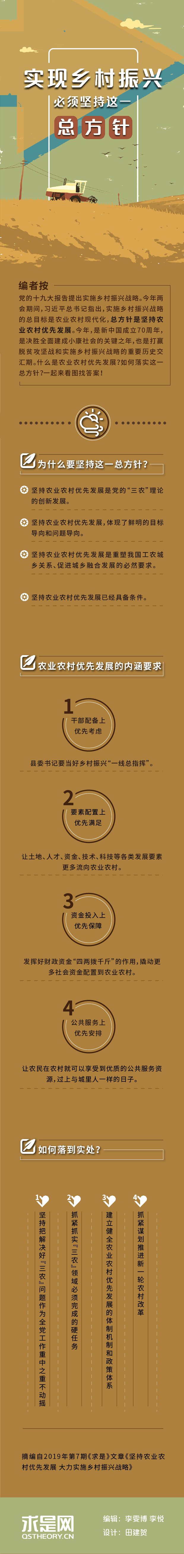 編者按:黨的十九大報(bào)告提出實(shí)施鄉(xiāng)村振興戰(zhàn)略。今年兩會(huì)期間,習(xí)近平總書記指出,實(shí)施鄉(xiāng)村振興戰(zhàn)略的總目標(biāo)是農(nóng)業(yè)農(nóng)村現(xiàn)代化,總方針是堅(jiān)持農(nóng)業(yè)農(nóng)村優(yōu)先發(fā)展。今年,是新中國(guó)成立70周年,是決勝全面建成小康社會(huì)的關(guān)鍵之年,也是打贏脫貧攻堅(jiān)戰(zhàn)和實(shí)施鄉(xiāng)村振興戰(zhàn)略的重要?dú)v史交匯期。什么是農(nóng)業(yè)農(nóng)村優(yōu)先發(fā)展?如何落實(shí)這一總方針?一起來(lái)看圖找答案!