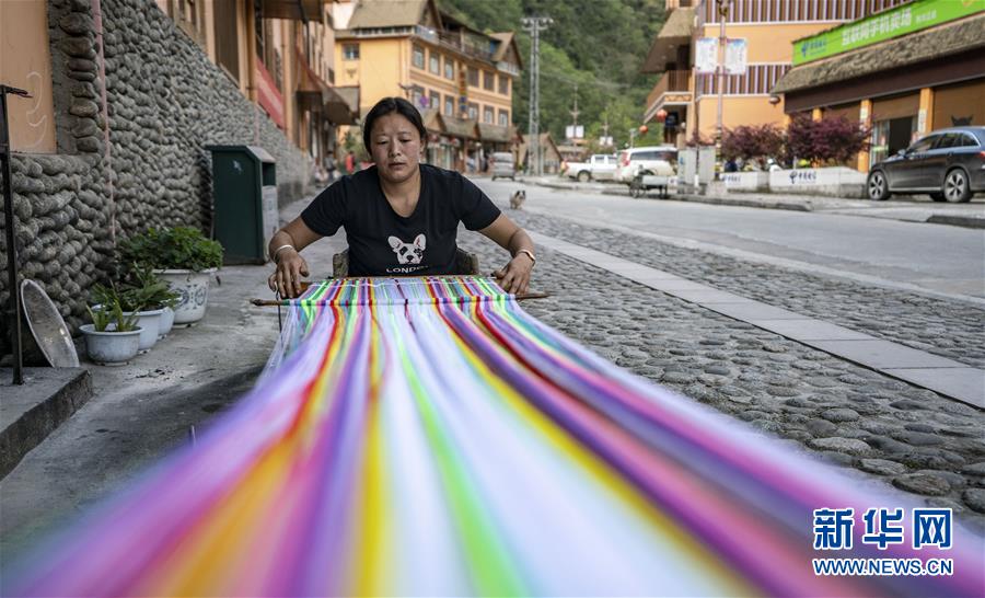 4月13日,云南省貢山縣獨(dú)龍江鄉(xiāng)村民和秋麗在家門口編織獨(dú)龍?zhí),她還在街邊開了一家燒烤店。新華社記者江文耀攝