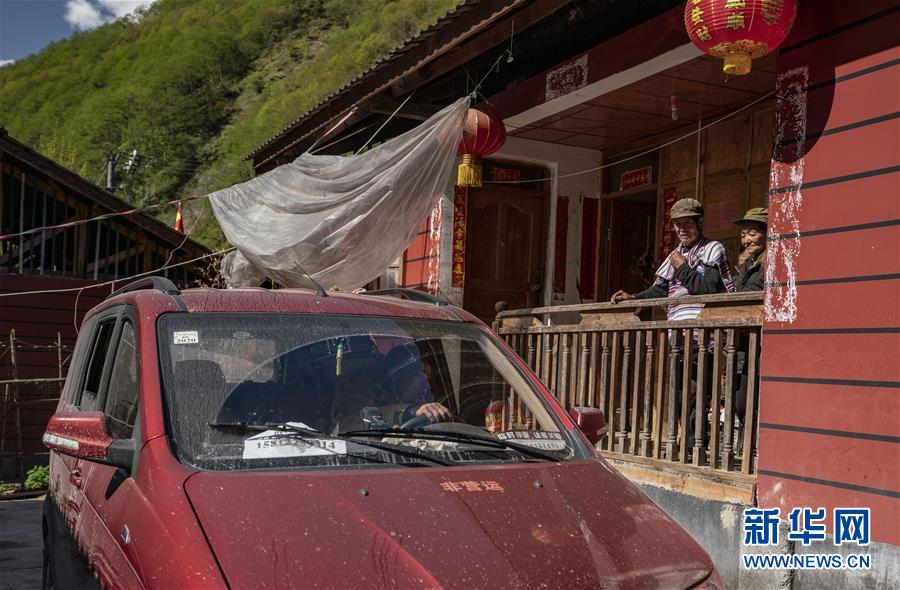 4月13日,云南省貢山縣獨(dú)龍江鄉(xiāng)獻(xiàn)九當(dāng)村迪蘭村民小組村民李新榮(右二)看著兒子開車進(jìn)院。 新華社記者江文耀攝